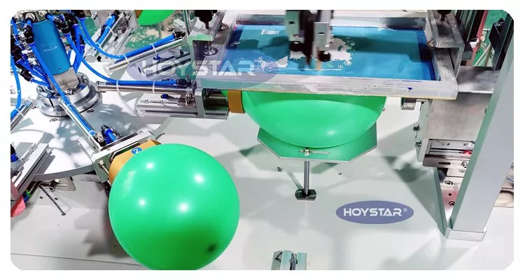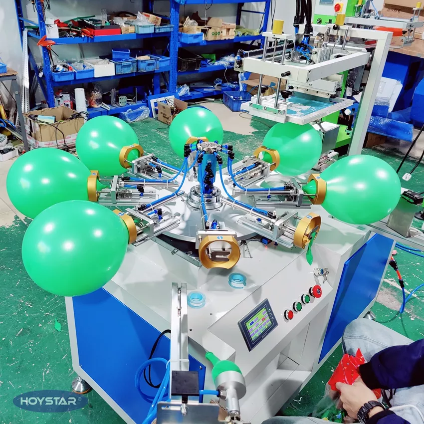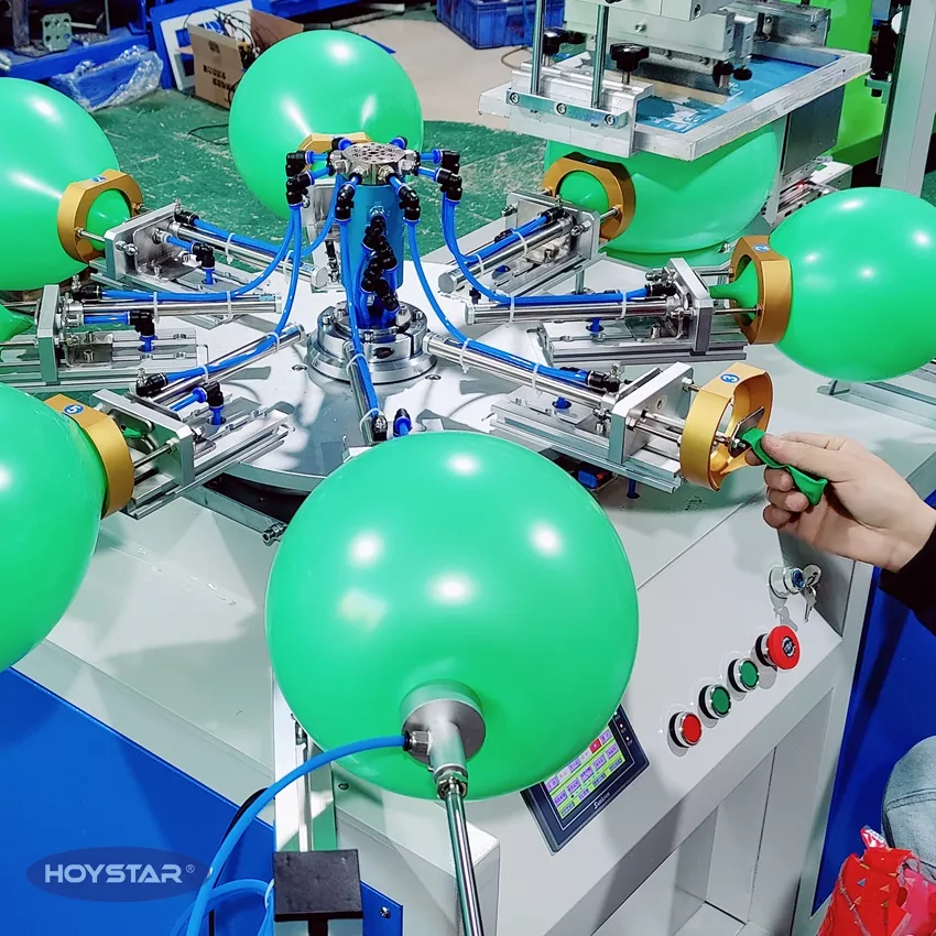 HOYSTAR es un fabricante y proveedor confiable en China; Esta máquina serigráfica de globos de látex de un solo color HOYSTAR está diseñada para imprimir en globos de látex. Equipado con mesa de trabajo giratoria, soplado automático, rotación automática, secado automático, funciones de descarga automática. Control de pantalla táctil PLC, interfaz fácil de usar para una operación segura e intuitiva. La máquina combina velocidad, precisión y facilidad de uso.