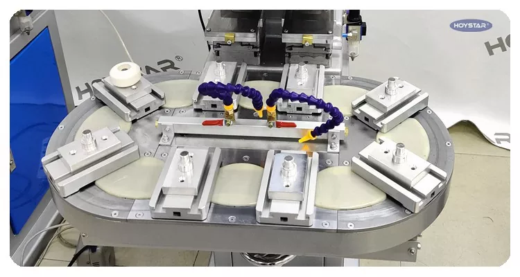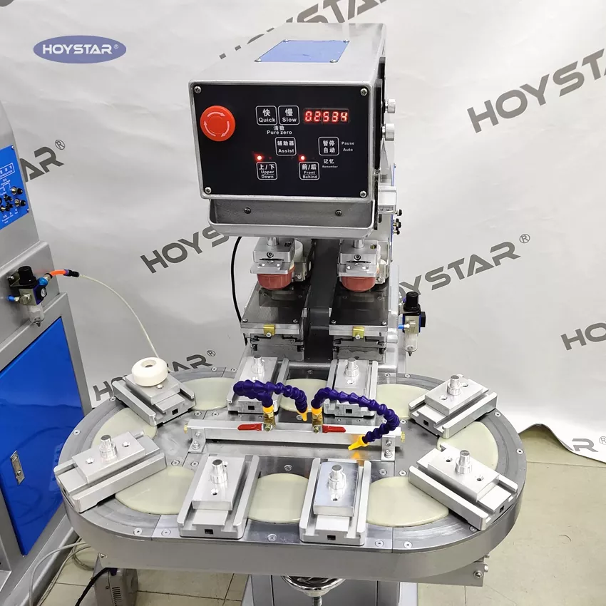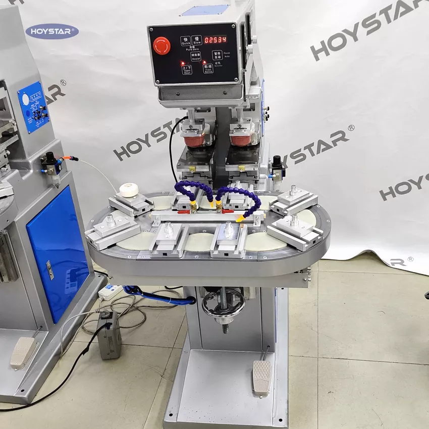 HOYSTAR es un fabricante y proveedor confiable en China; La máquina tampográfica de mesa giratoria de dos colores HOYSTAR es un equipo de impresión rentable y de alta capacidad. La máquina ofrece un ajuste conveniente, operación estable y buen efecto de impresión. La máquina ofrece una calidad de impresión constante y es adecuada para imprimir una amplia gama de artículos, como productos electrónicos, carcasas de plástico, productos de hardware, artículos de papelería, pequeñas artesanías, así como pequeños logotipos en la superficie de regalos y más. Puede cumplir con diversos requisitos de impresión en dos colores de los clientes.